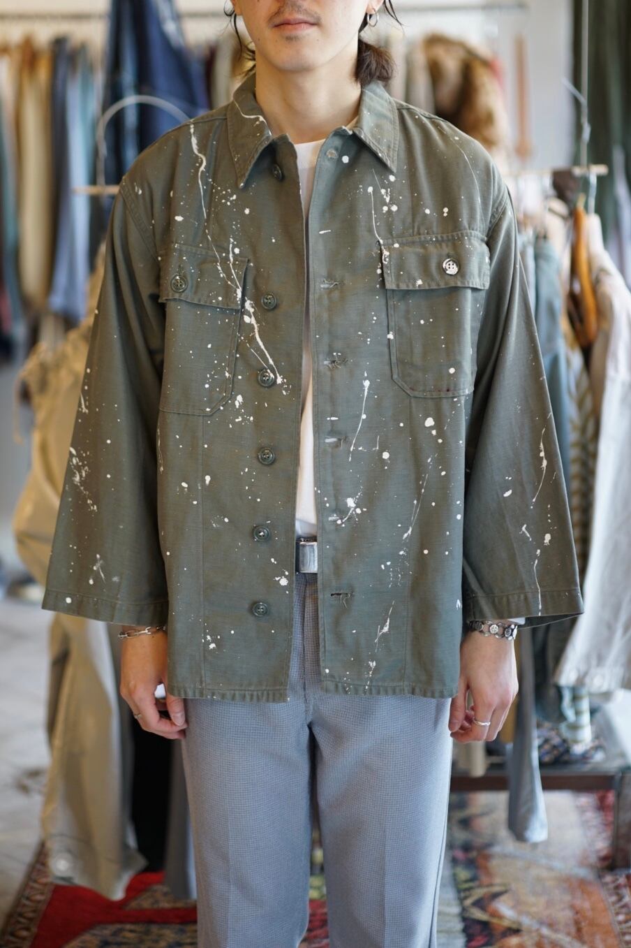 白のハンドペイントが「一点物」なミリタリーシャツ。