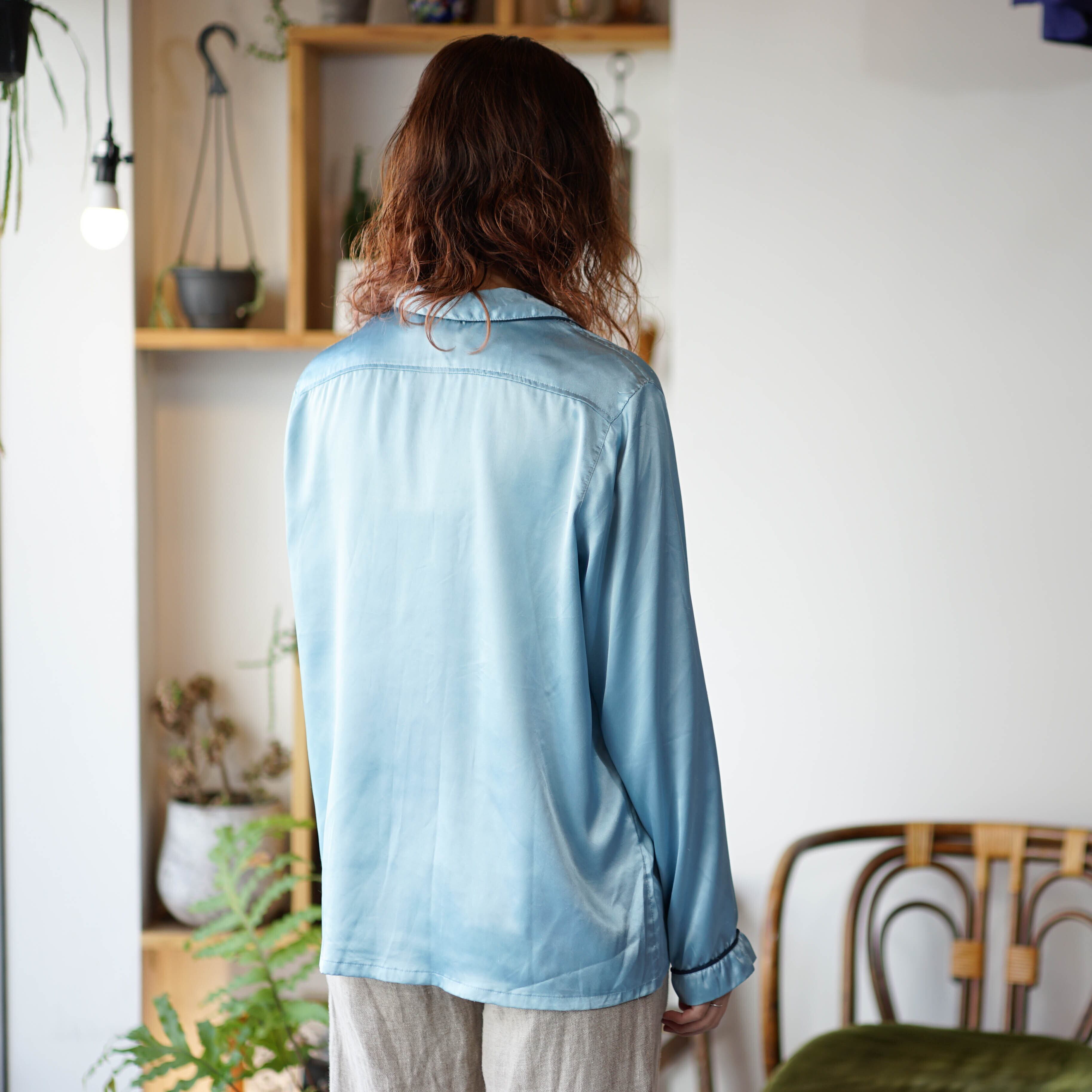 春夏 サテン 長袖 パジャマ シャツ(ブルー)