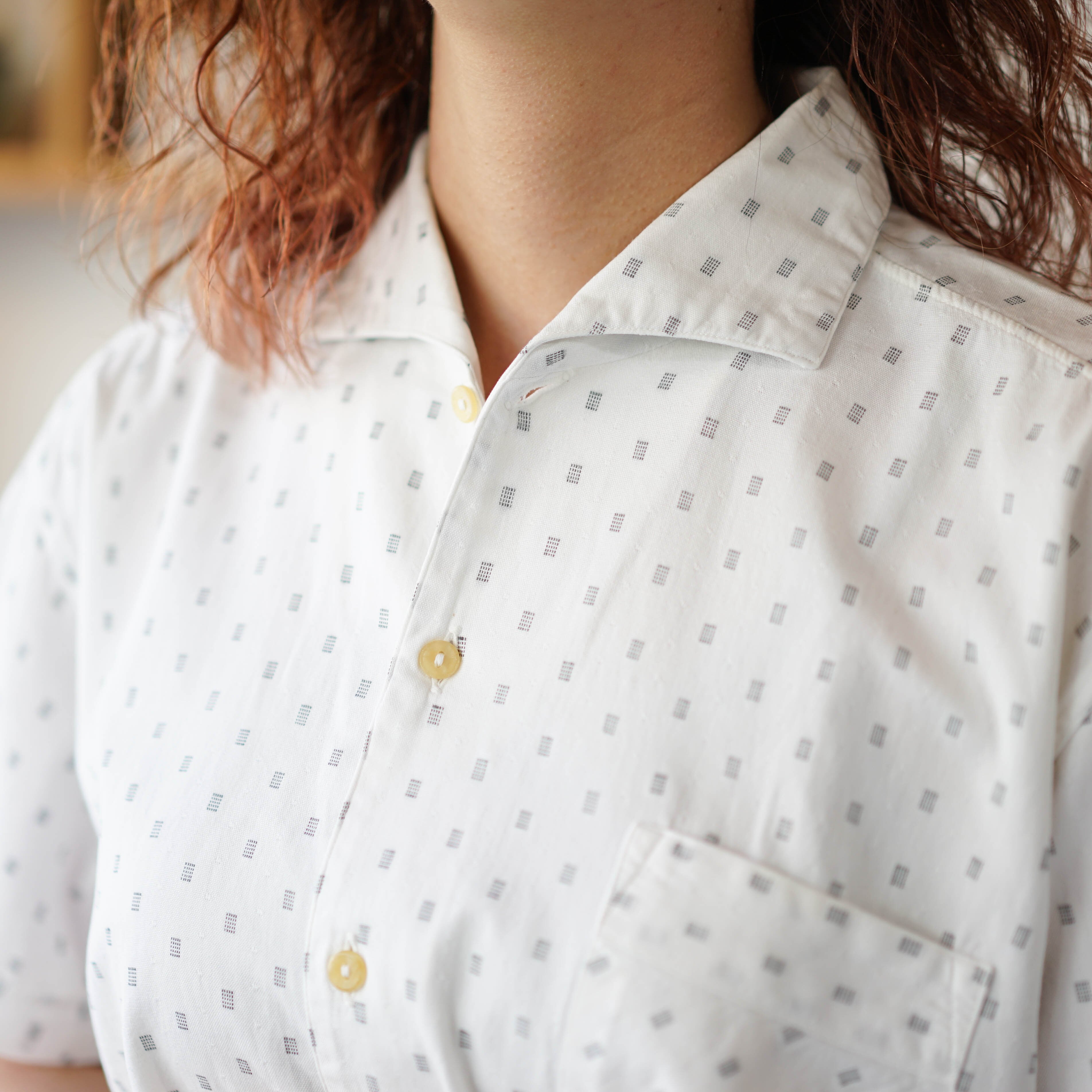 シャークカラー(サメのヒレのような襟デザイン)デザインでメンズライクなかっこいい雰囲気です。白地にこげ茶色の模様が控えめに入っています。