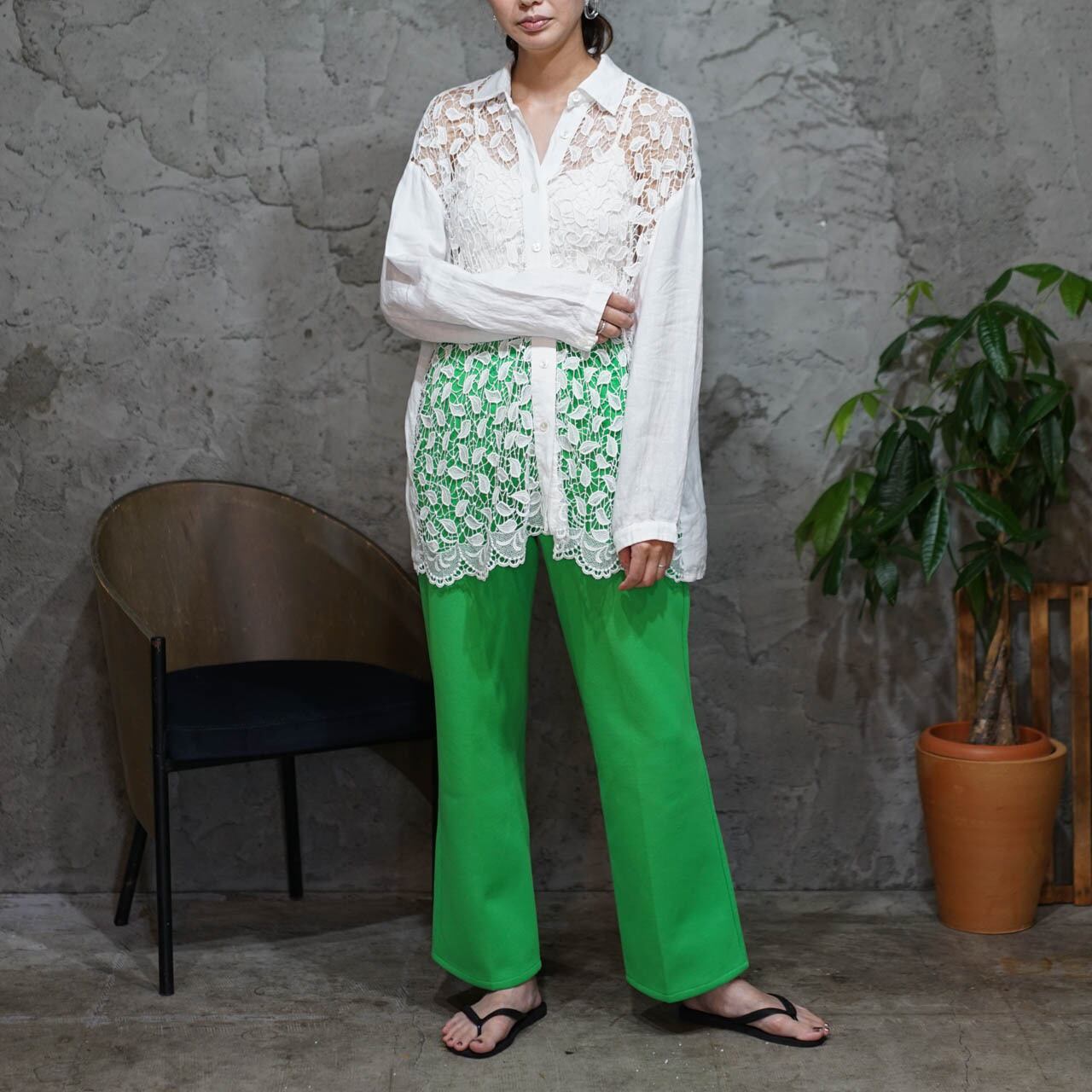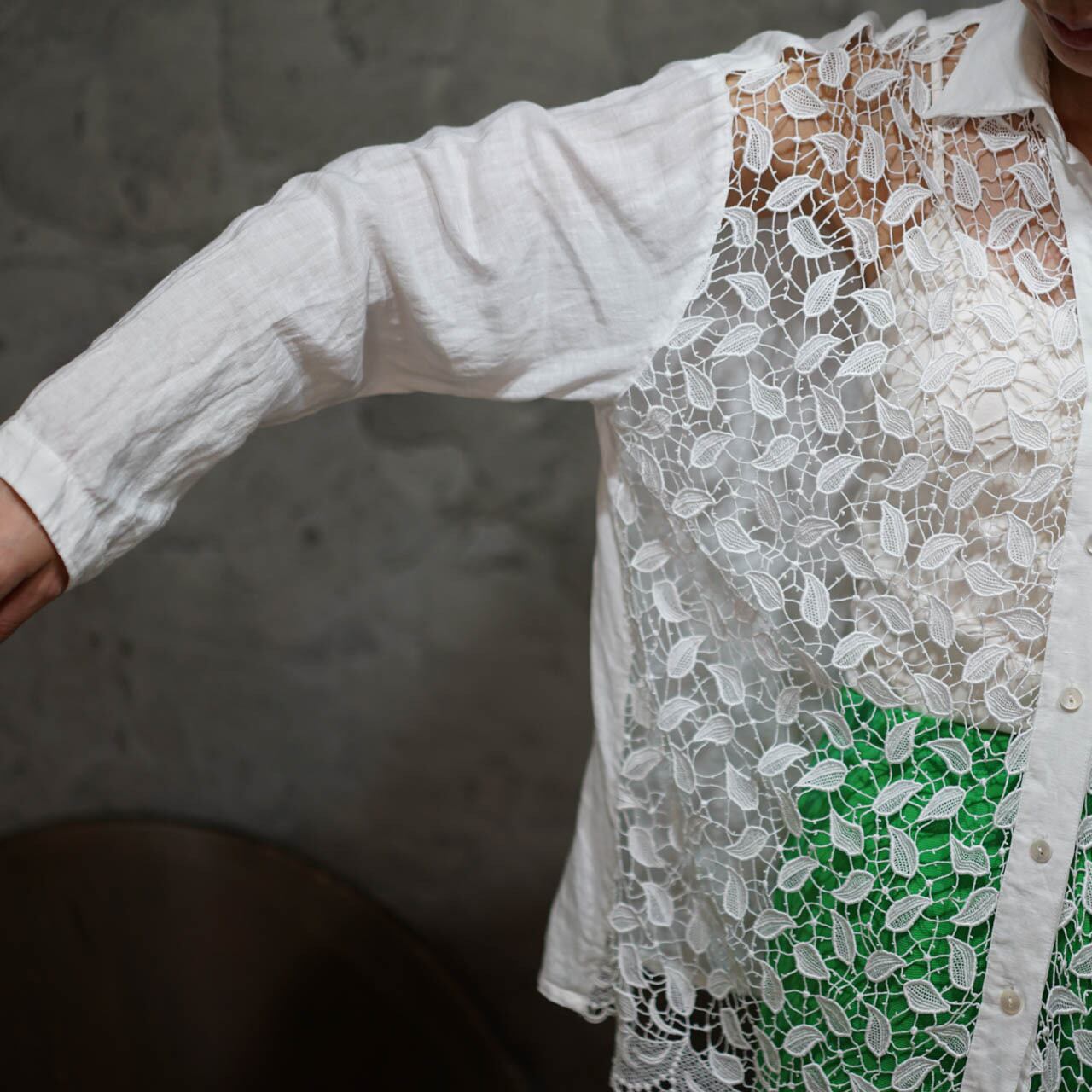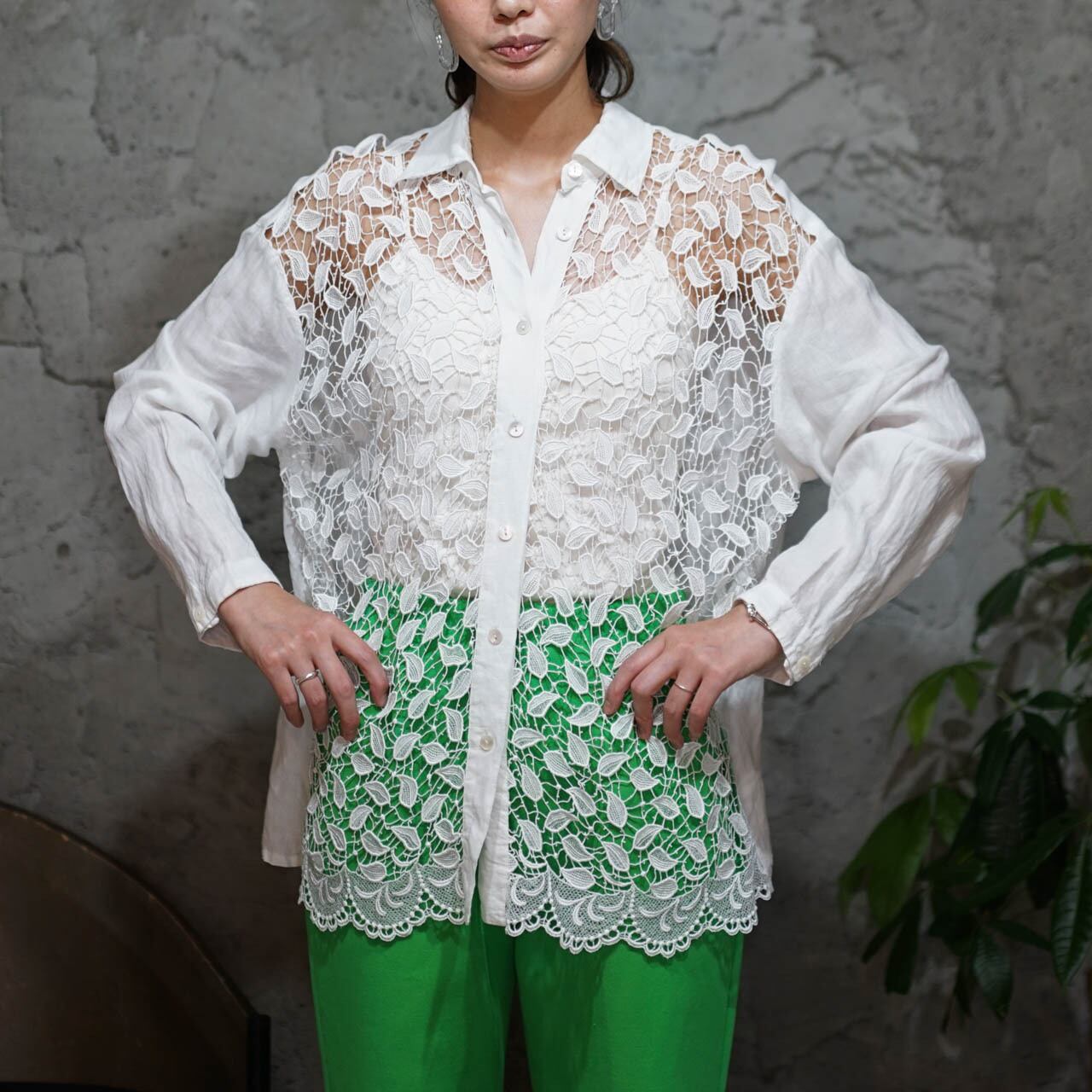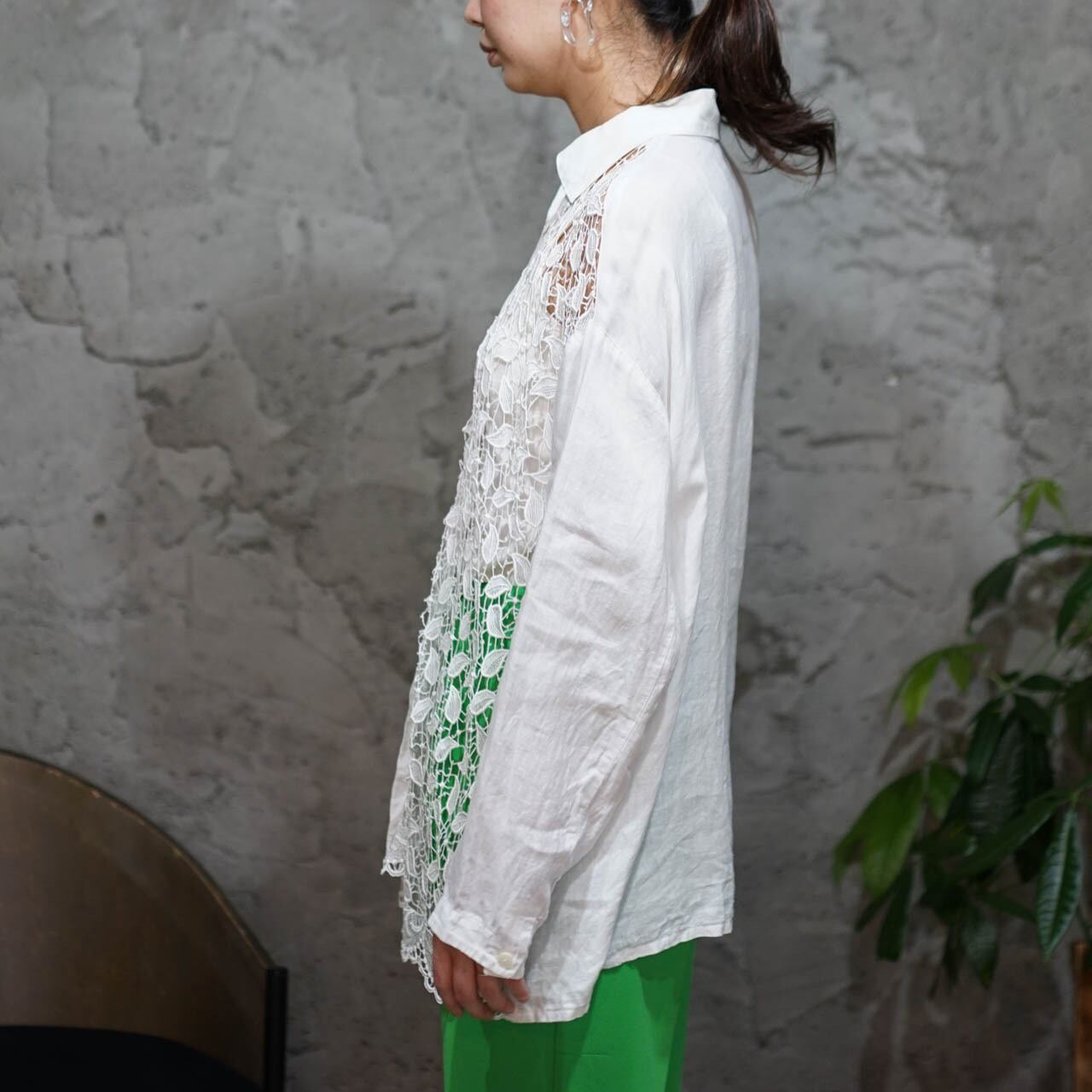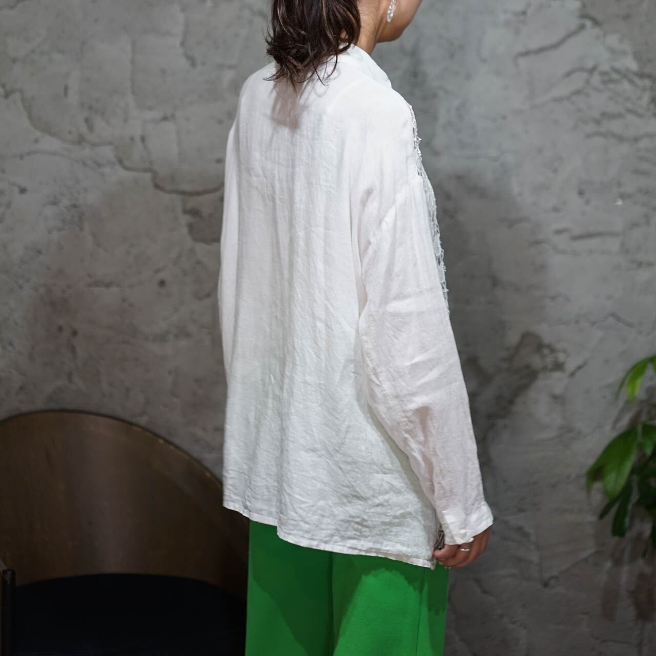レース カッティング 長袖 リネン ブラウス (ホワイト)