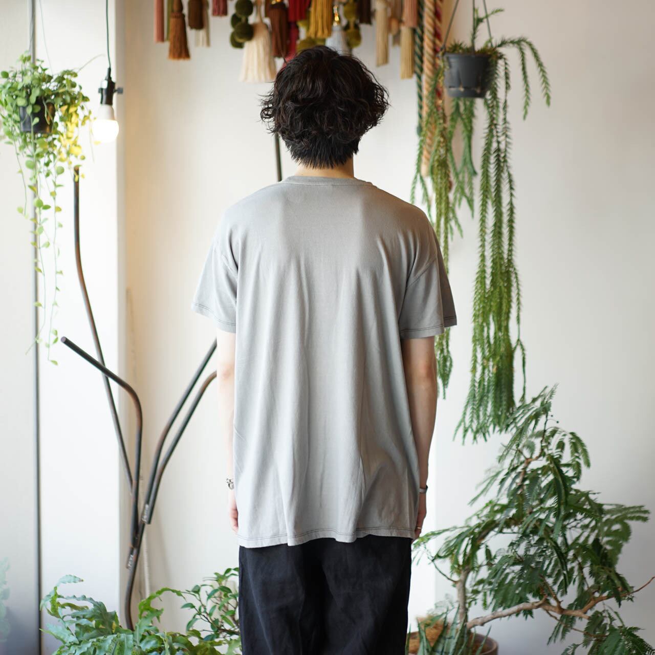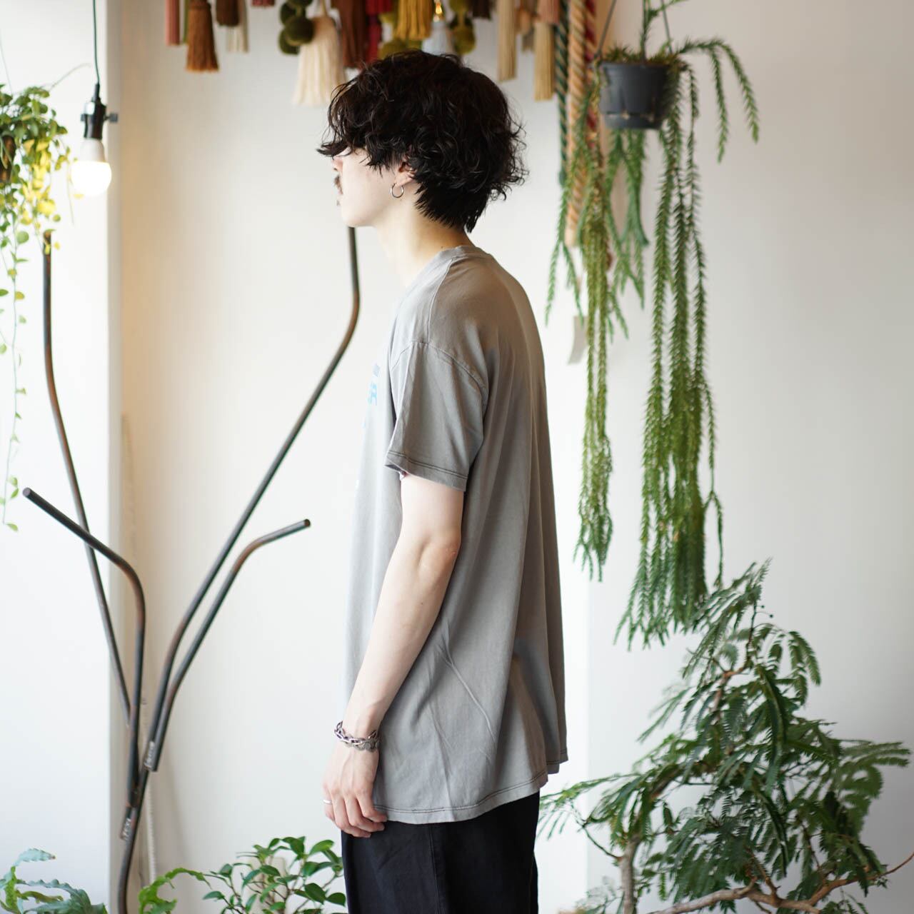 淡いグレーの色味、ブルーとホワイトのプリントが優しい印象の1枚。ボトムはネイビーやブラックなど締め色が相性良いです。
