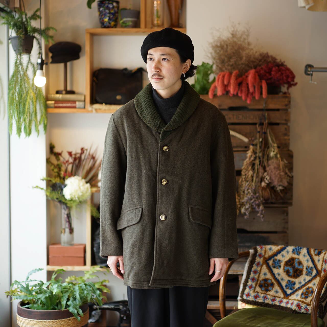ショールカラー ウール コート(オリーブ)