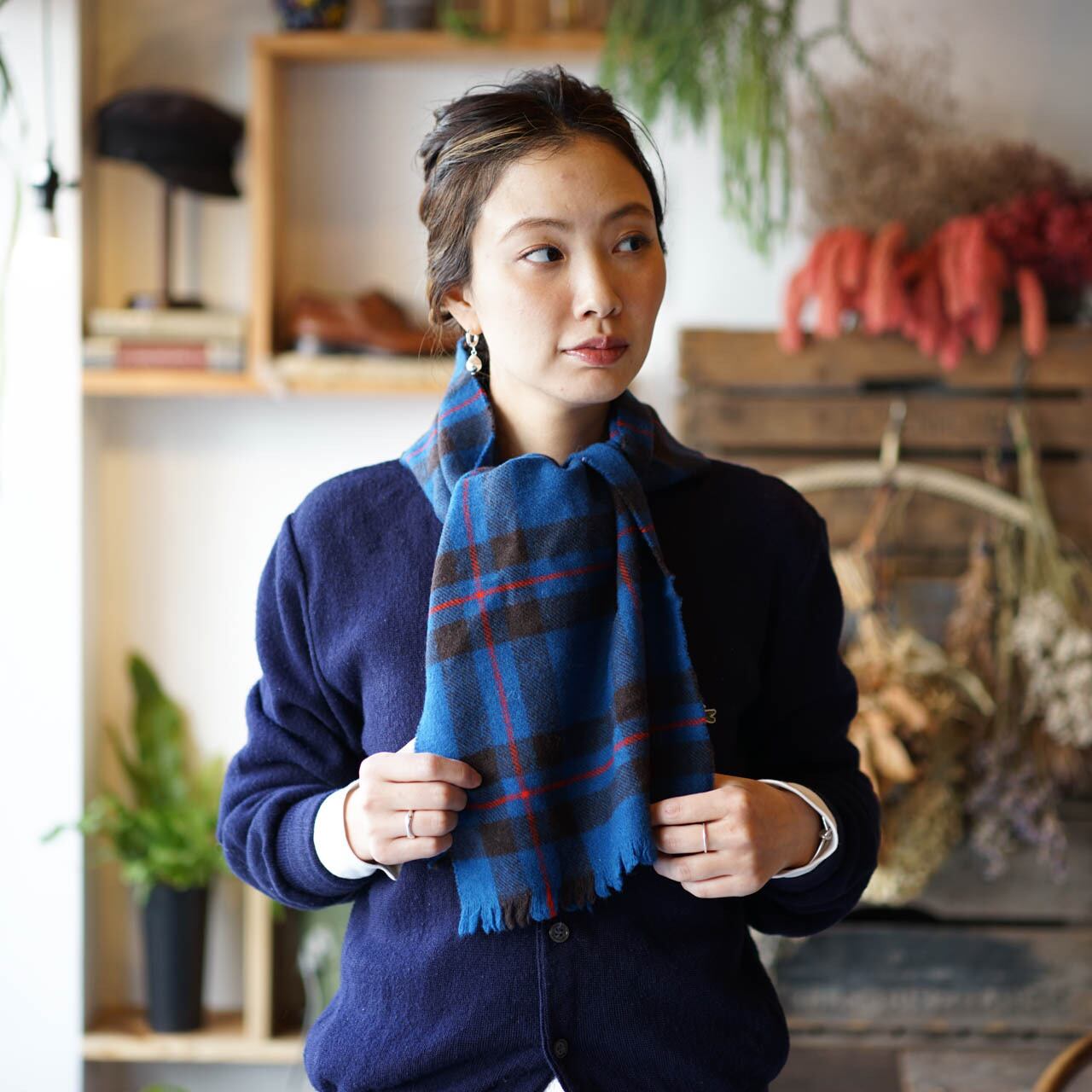 チェック柄 ウール マフラー(ブルー)