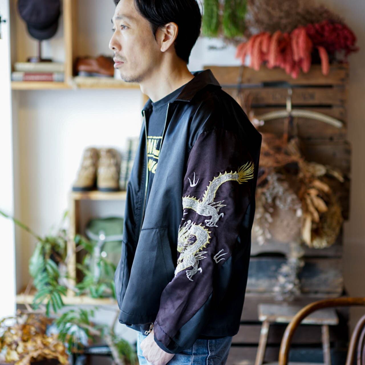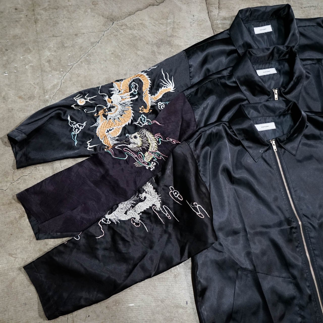 リメイクブランド「POTIONY」より、古着のチャイナガウンをリメイクした、サテンジャケットの登場です。