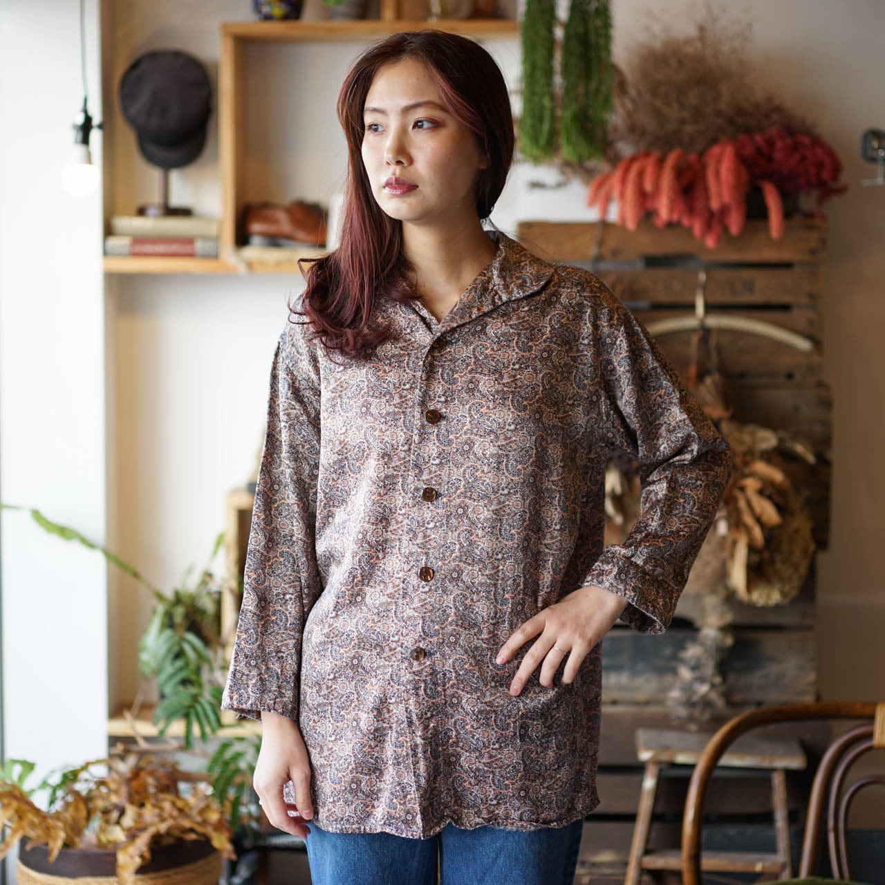 ペイズリー柄 サテン パジャマ シャツ(ピンクベージュ)