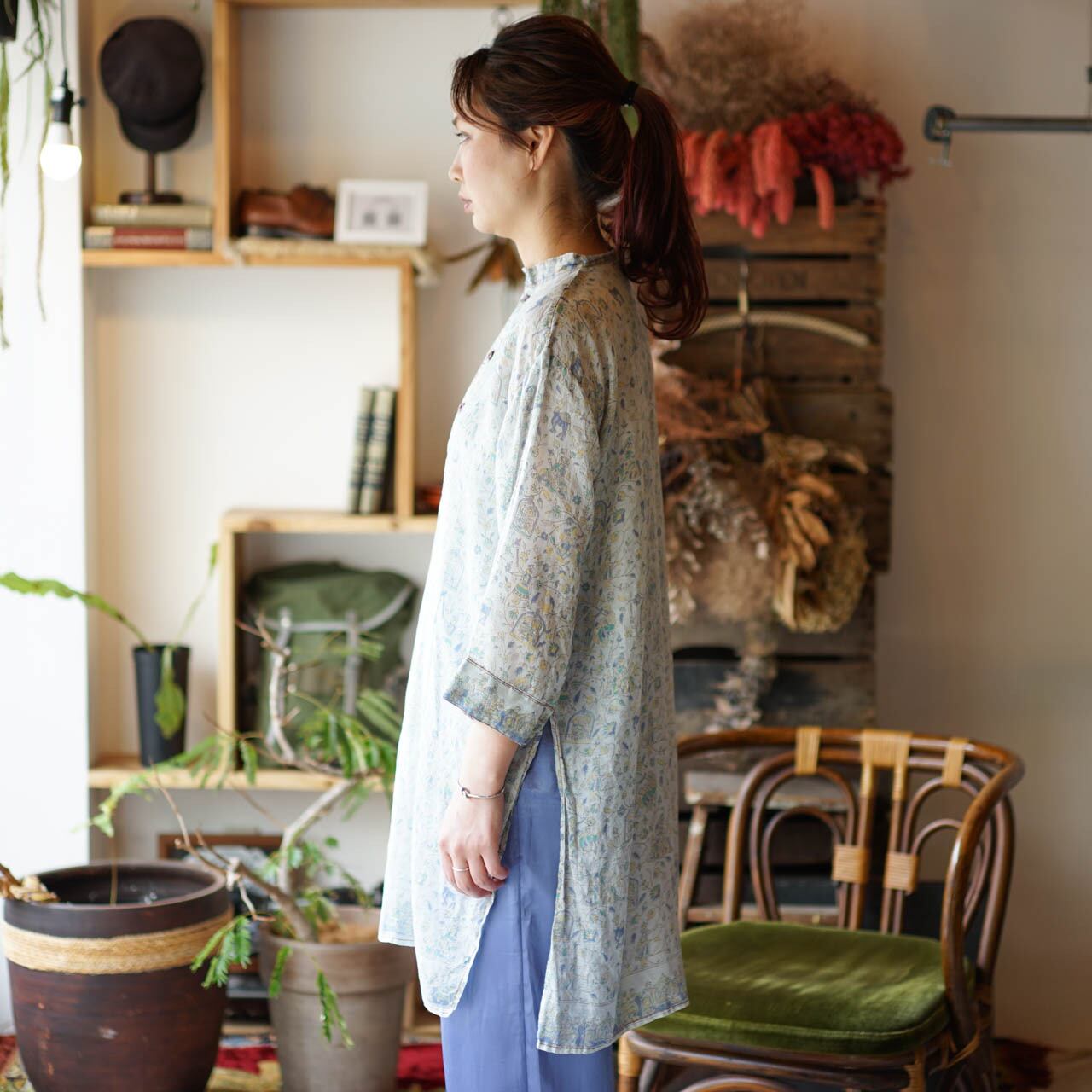 植物やラクダなどの柄がかわいいプルオーバータイプのブラウス。襟のないスタンドカラーの首元は、今っぽさがあります。