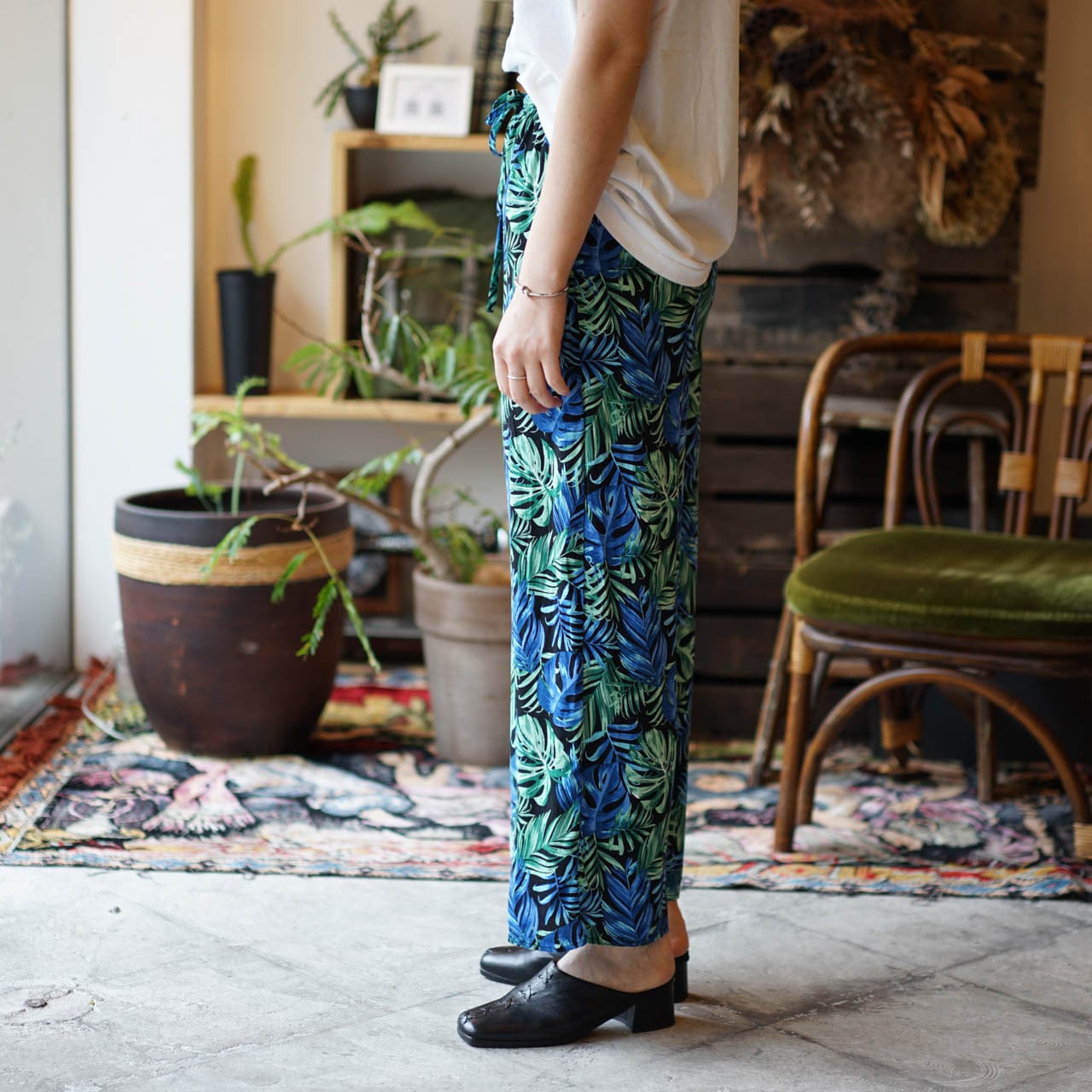 レーヨン ボタニカル柄 パンツ (ブルートーン)