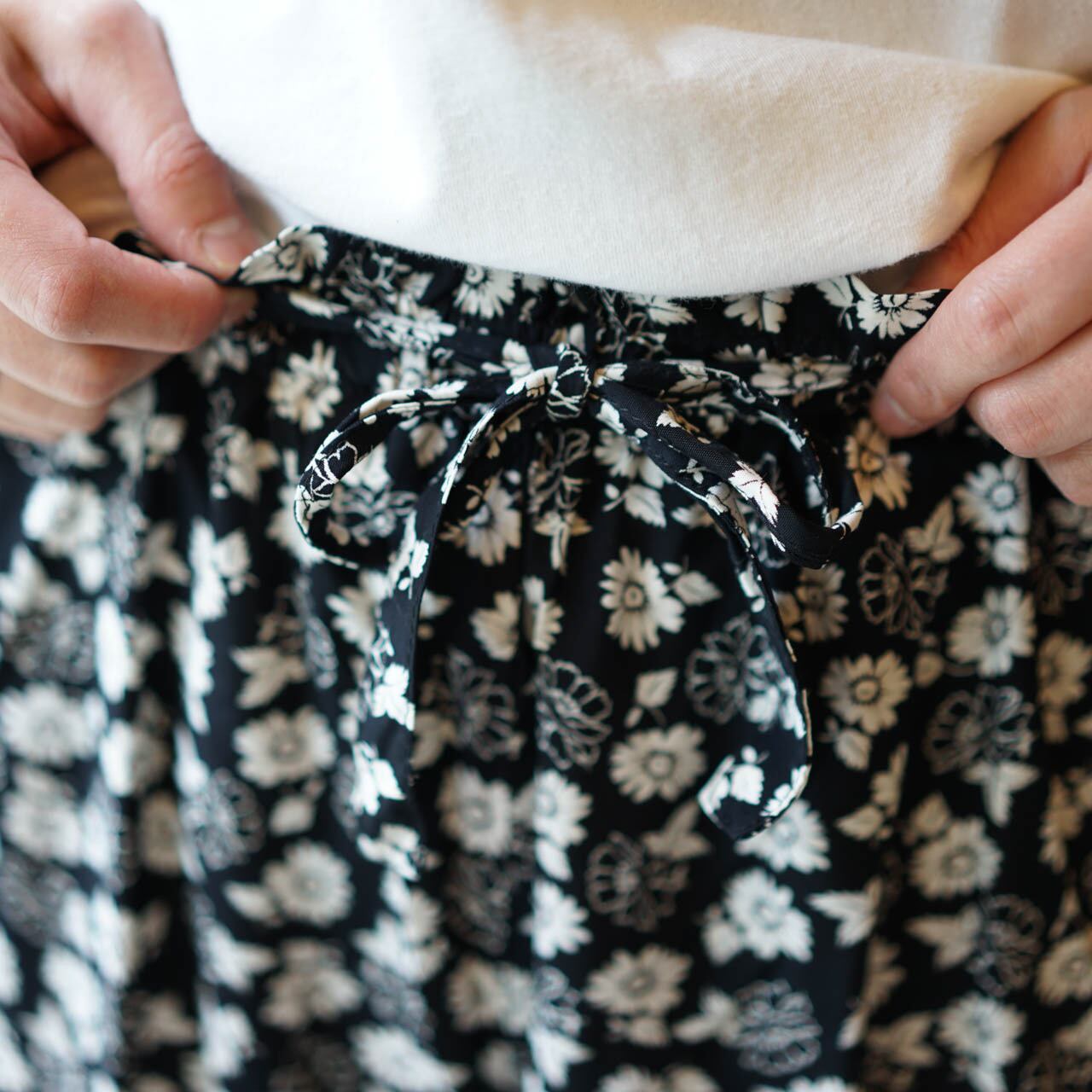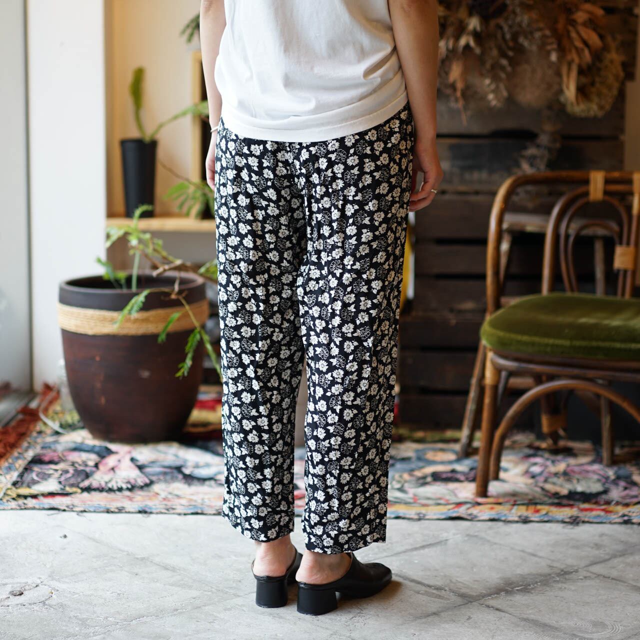夏に着たい涼しいレーヨン生地のイージーパンツ。柄物ですがモノトーンなので挑戦しやすいです。