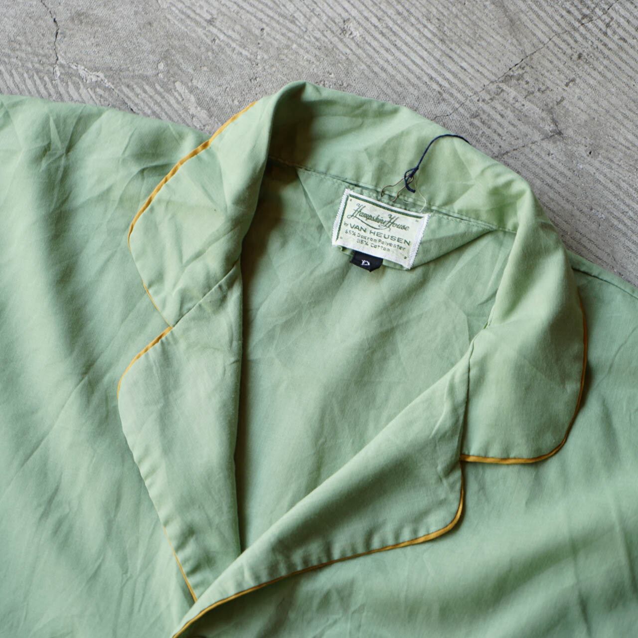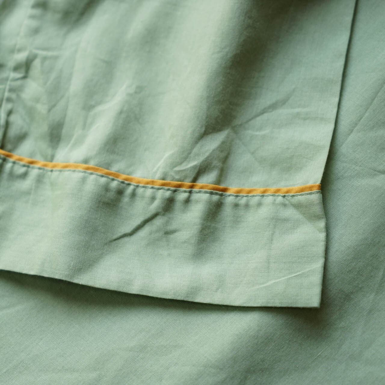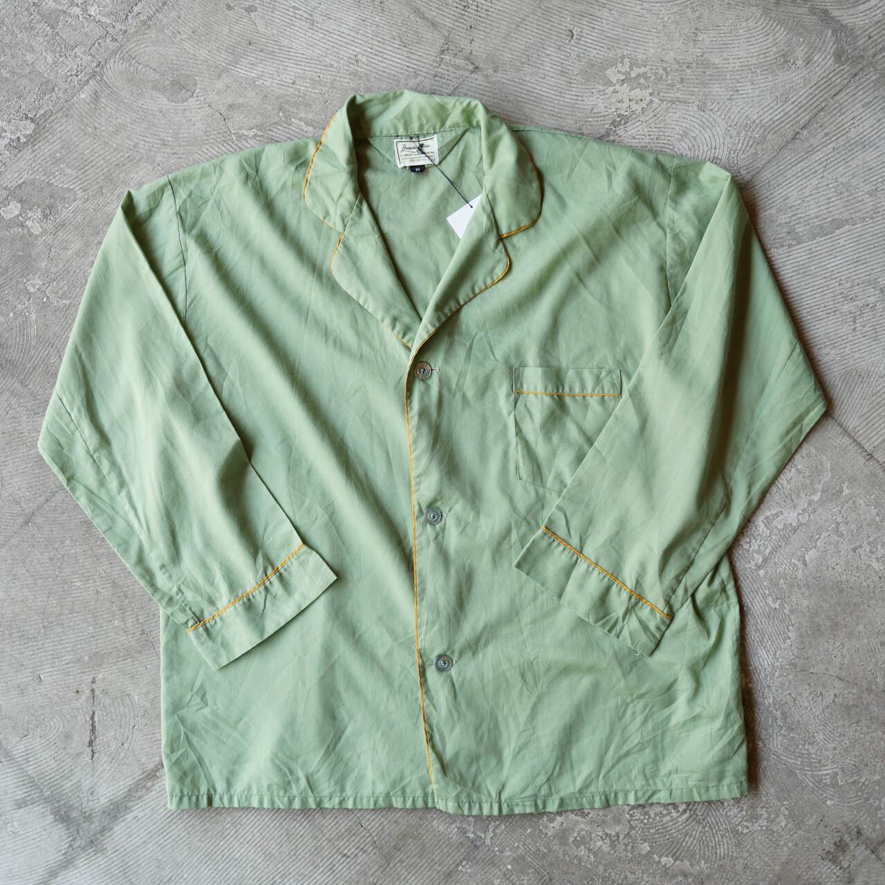 ペールトーンのグリーンが春夏らしいパジャマシャツ。オレンジ色のパイピングが効いています◎梅雨時期の羽織りや、日差し対策に。