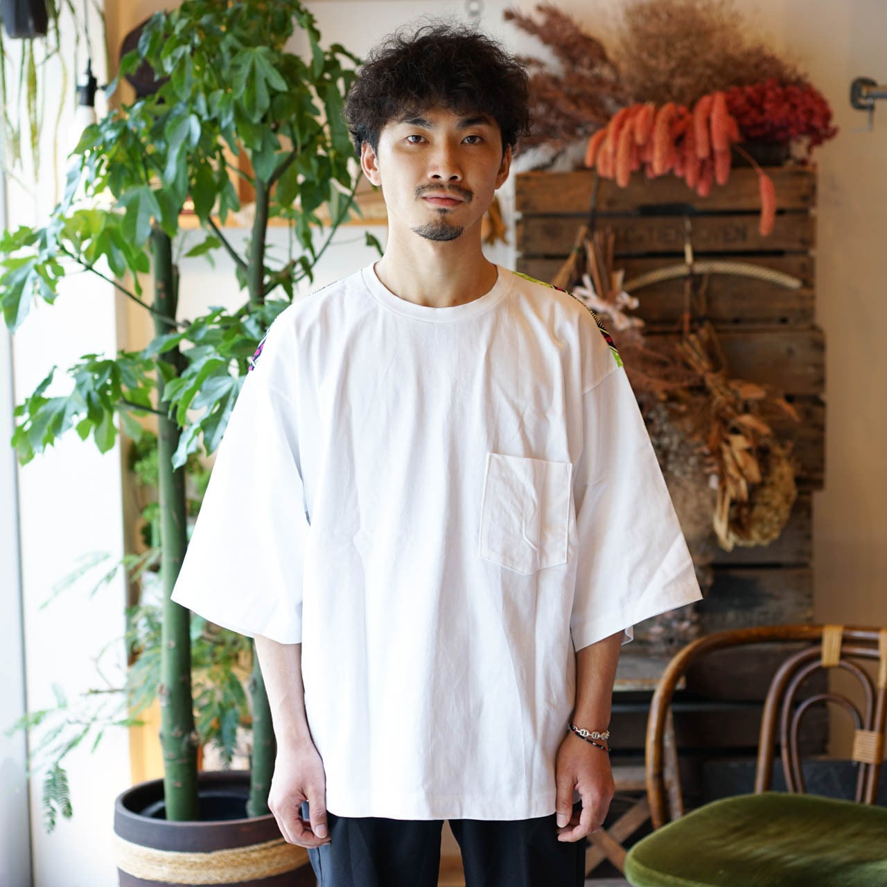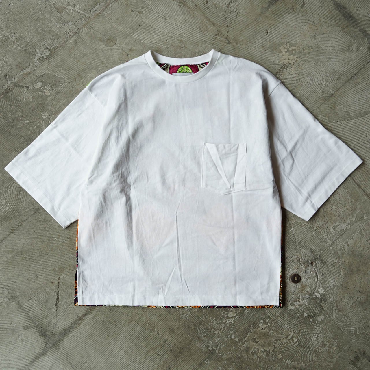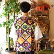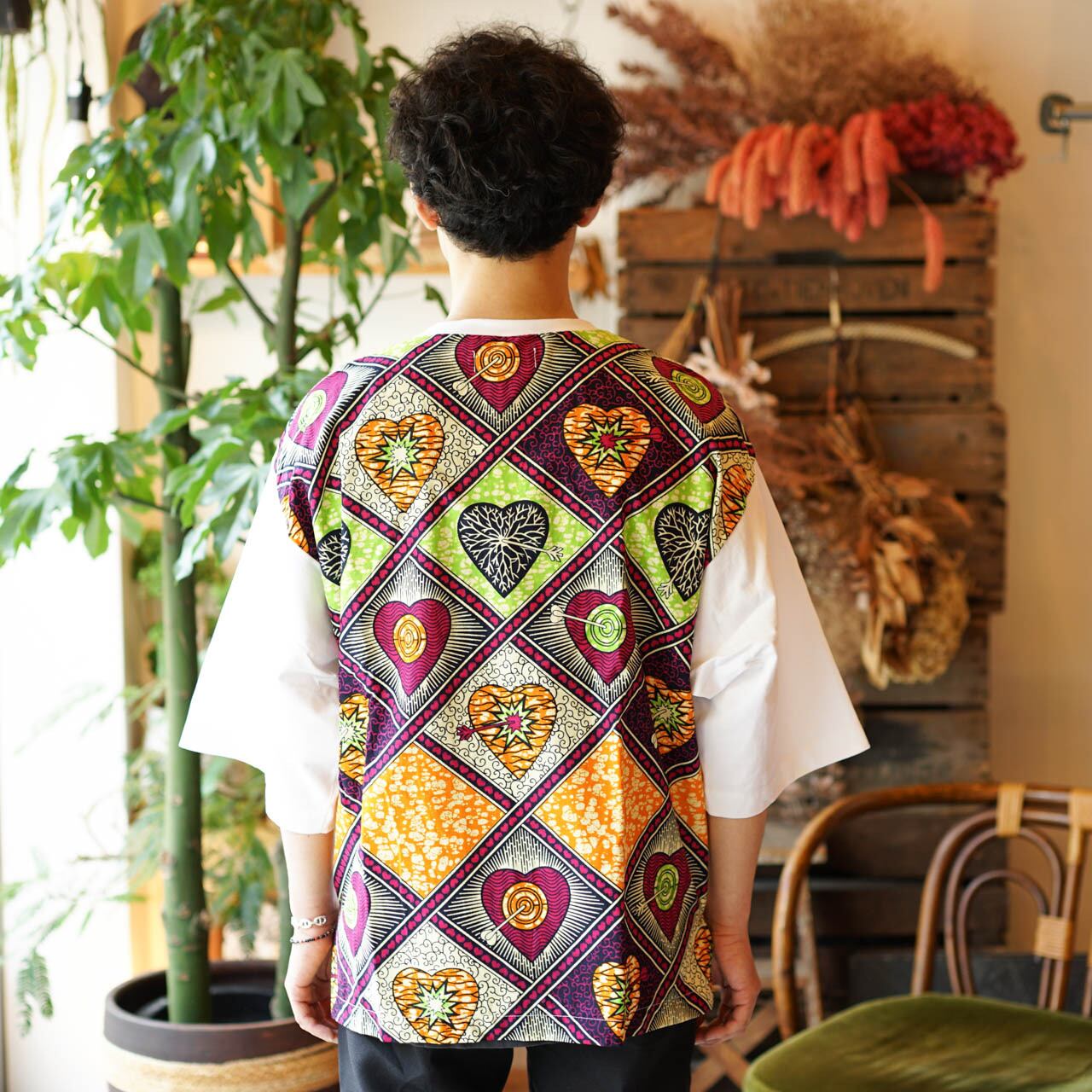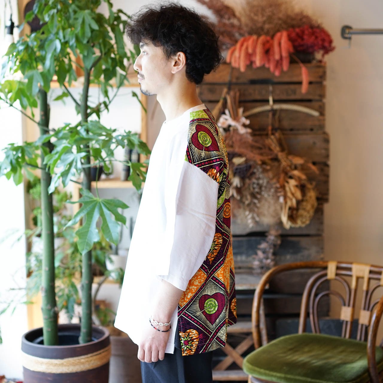 古着のアフリカンバティック生地を使った、オリジナル商品。前身頃の白い生地は新品を使い、古着と新品のハイブリッドな1着です。横に広いゆるっとしたシルエットは男女問わず着ていただけます。
