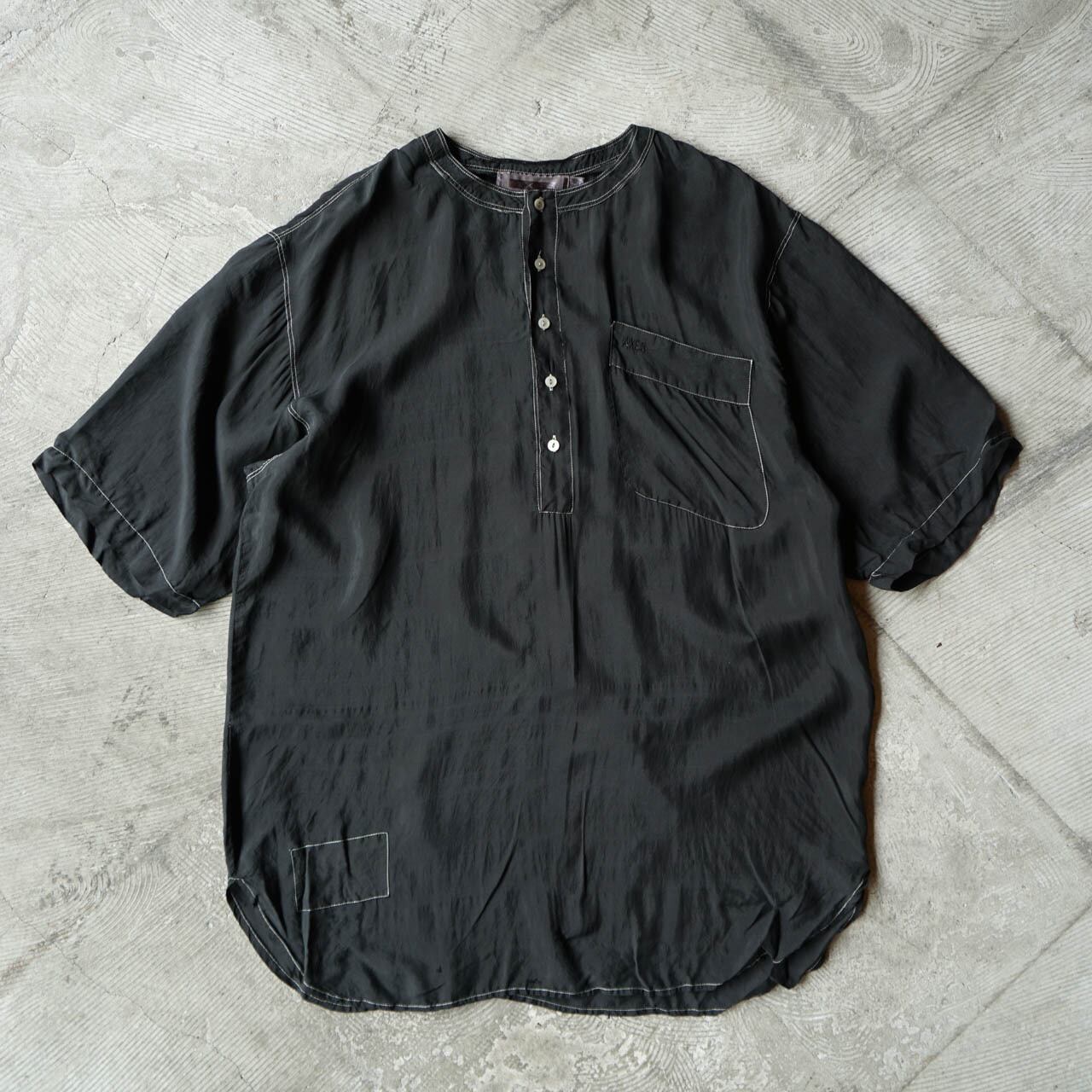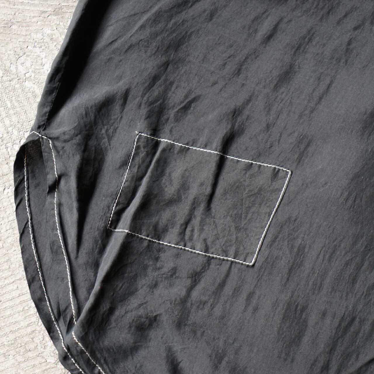 ヘンリーネックタイプのシルクシャツ。後染め加工でブラックに染めたこだわりの1着。