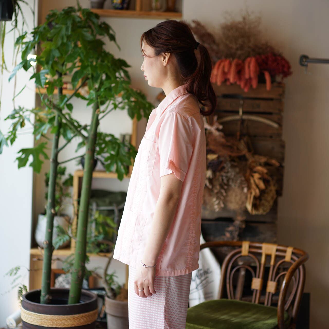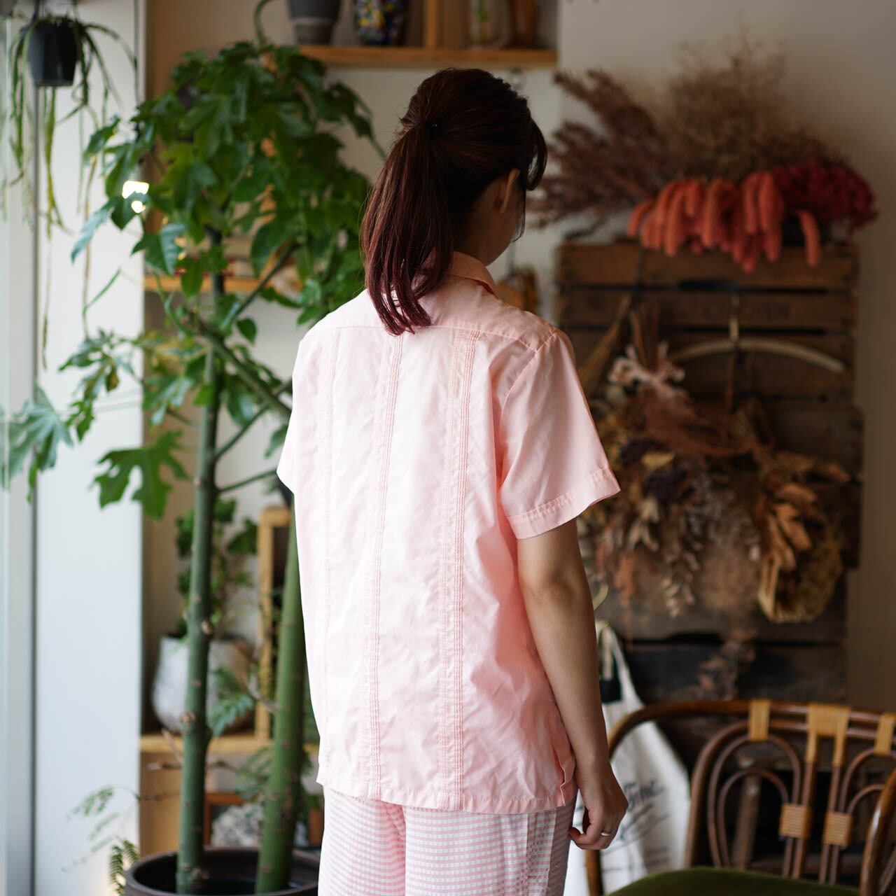 ピンクのかわいいキューバシャツ。暑い国で着られるアイテムなので、通気性ばっちりで涼しく着られます◎