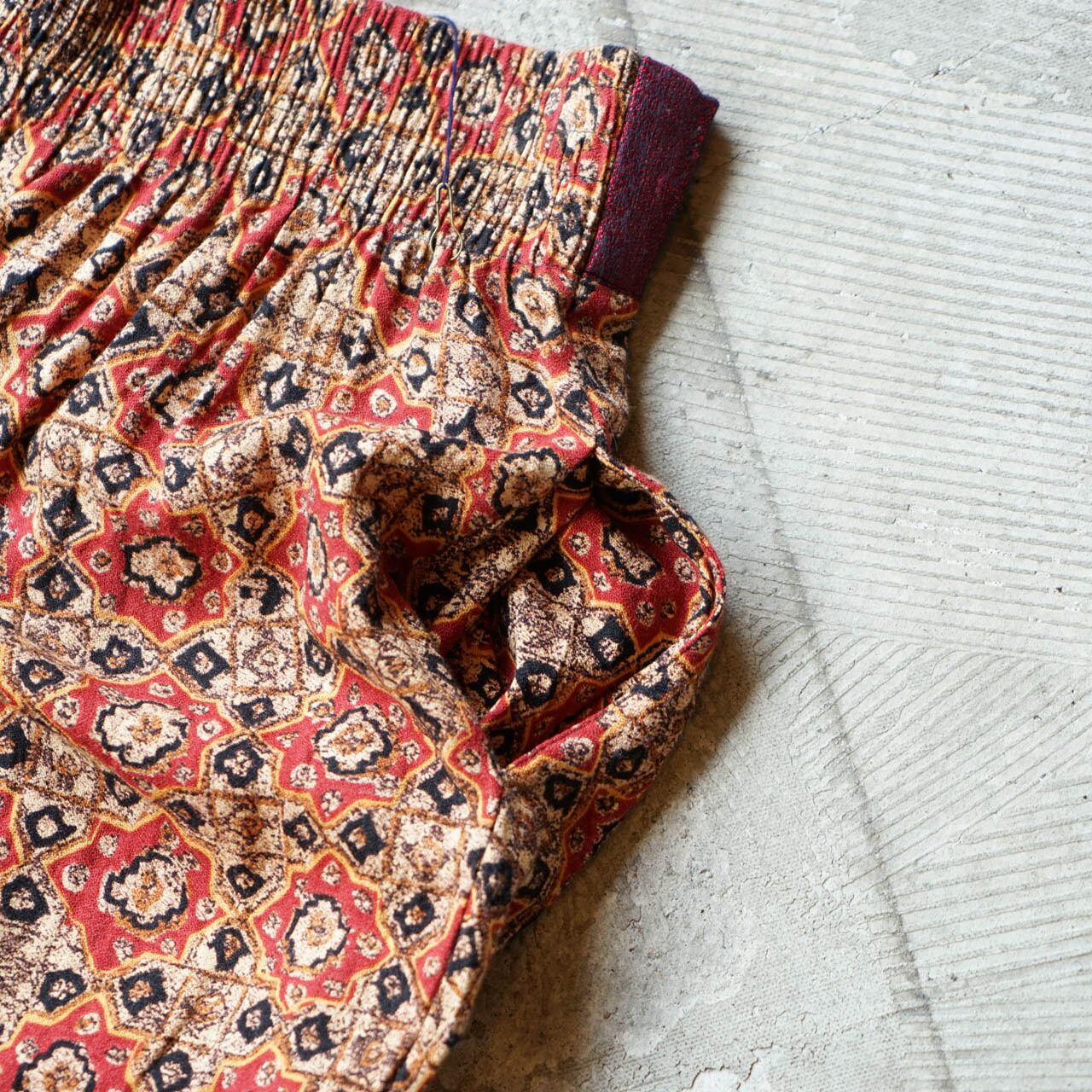 エスニック柄が目を引くイージーパンツ。ウエストの後ろ部分がゴムになっていて楽な着心地です。