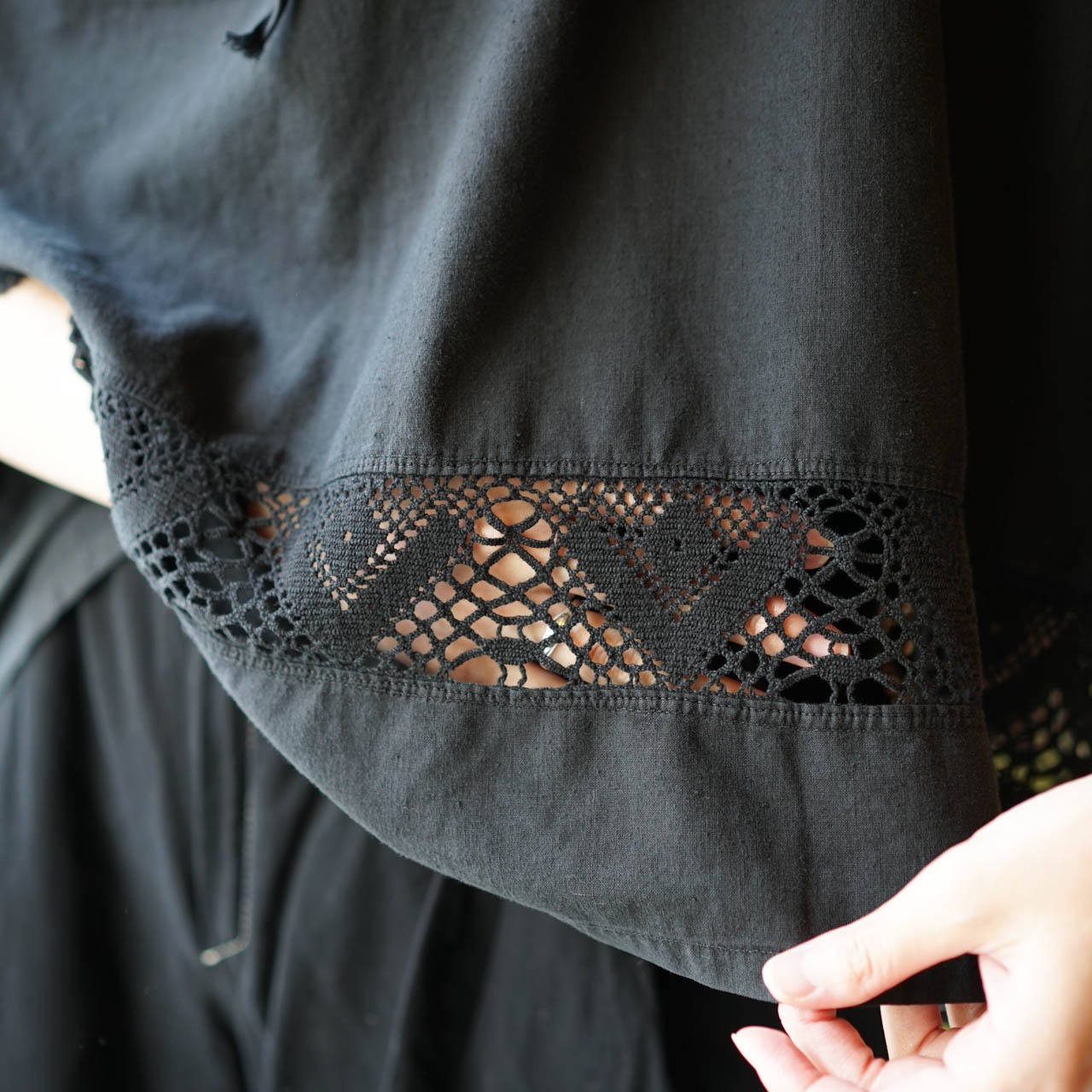 裾のクロシェ編みのようなデザインが特徴的なブラウス。後染めで黒に加工した商品で、ショートパンツに合わせて着たい夏の1枚です◎