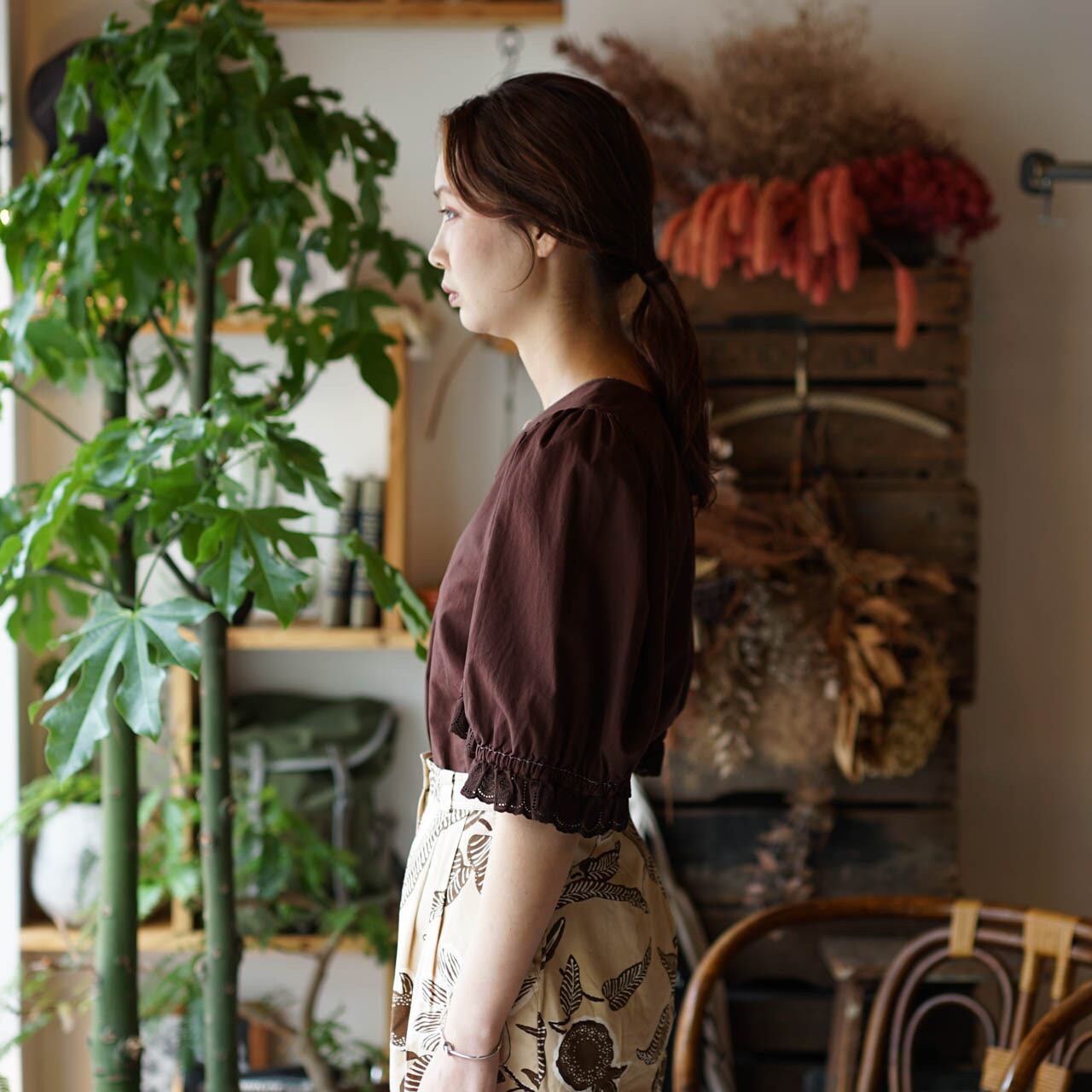 ブラウンに後染め加工したブラウス。真っ白だと可愛すぎてしまうパフスリーブブラウスですが、落ち着いた色味だとグッと着やすくなります◎