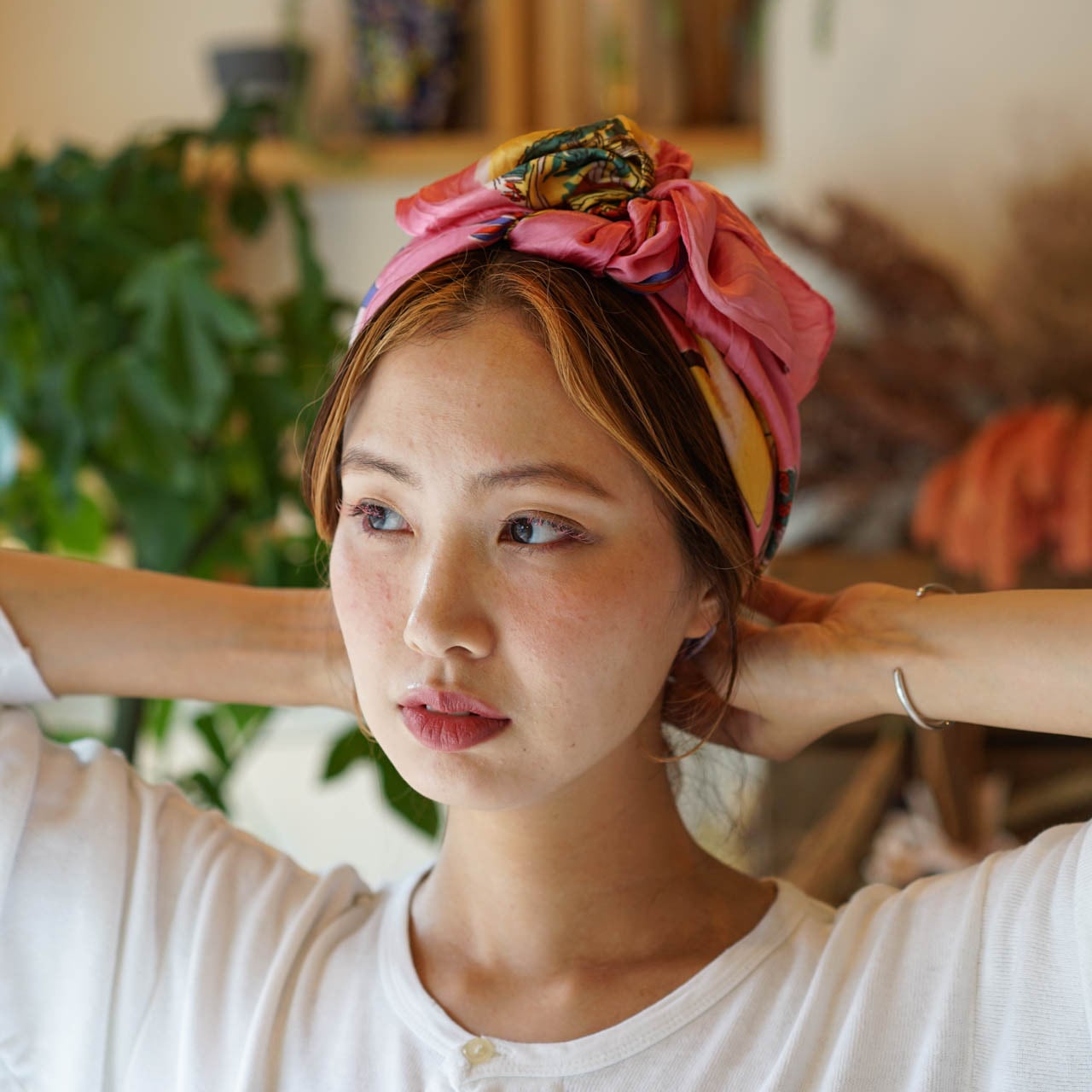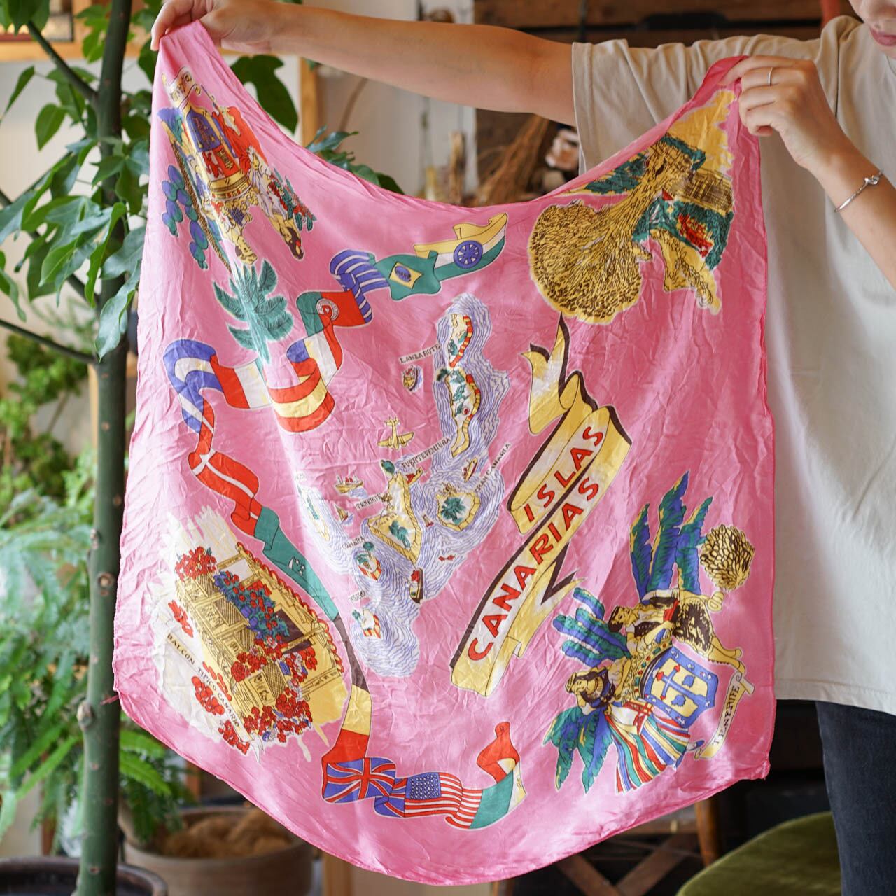 ピンク、イエロー、グリーンなど鮮やかなカラーリングの大判スカーフ。ヘアアレンジや部屋に飾るインテリアとしてもおすすめです◎
