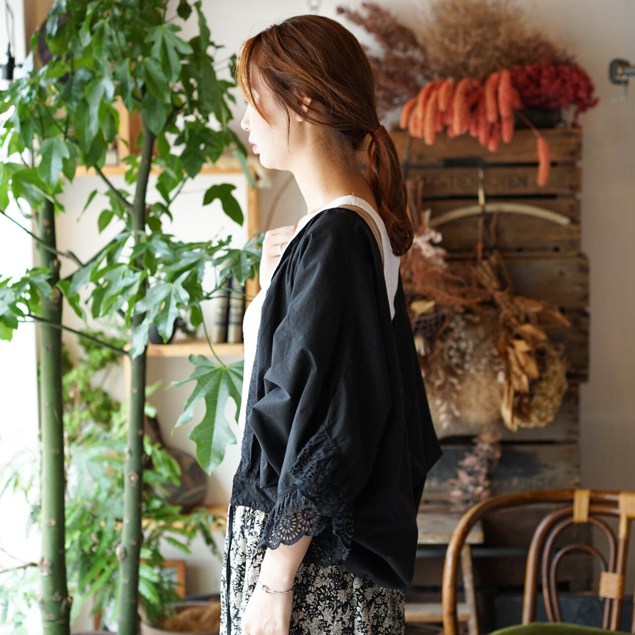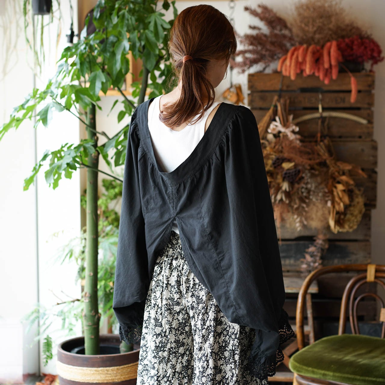 履くペチコートだったアイテムを黒染め加工し、ボレロとして着る発想の転換でおしゃれな1着に。上下逆さまに着ることで、まったく違う印象になります。