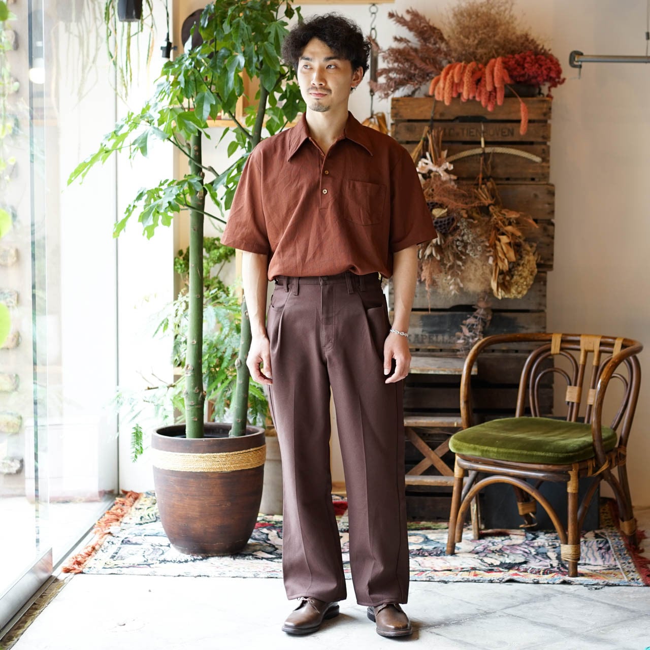 襟の形が特徴的なブラウンのポロシャツ。単体でもよし!インナー使いとしてもよし!タックインでの着こなしがおすすめの1枚です!