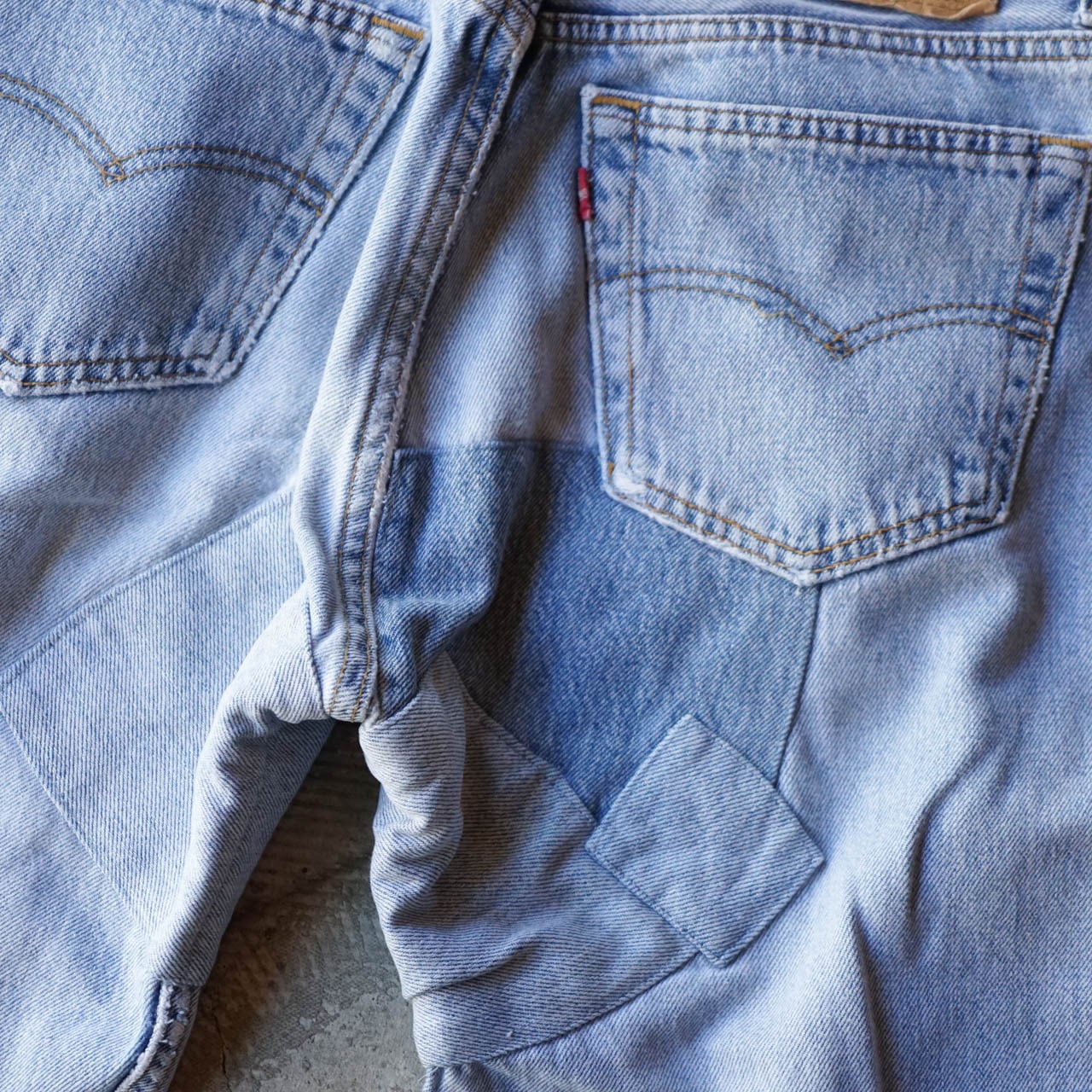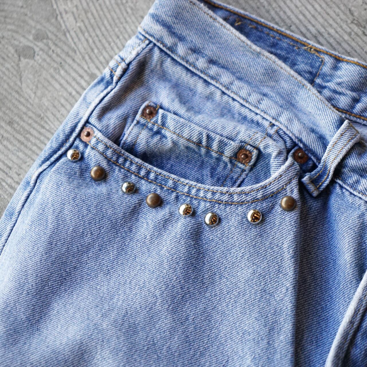 アメリカ製のリーバイス501のフロントポケット部分にスタッズを施したリメイクアイテム!おしり部分のパッチワークが古着の魅力を更に引き立たせており、魅力溢れるパンツに仕上がっています!!