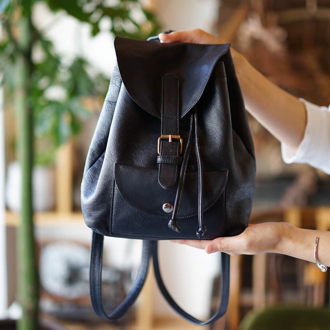 小ぶりなレザーバッグ、ブラックカラーは季節問わず使える万能アイテムです。荷物は少ない派の方におすすめしたいサイズ感です。