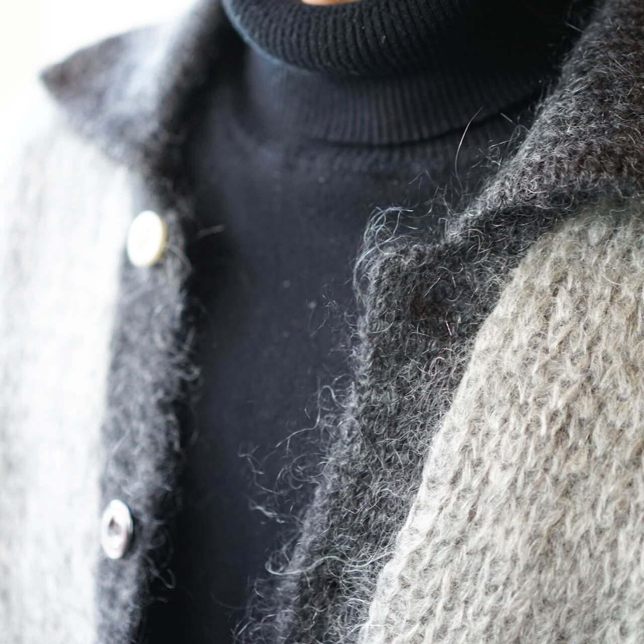 グレーの濃淡の配色が素敵なカーディガンニットです。両サイドにポケット付き。