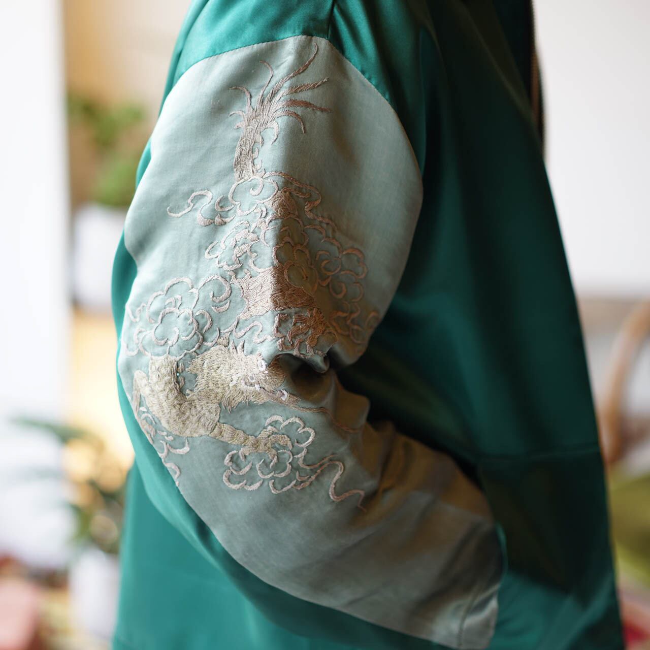 袖には古着のチャイナガウンの刺繍部分を大胆に使用しております。