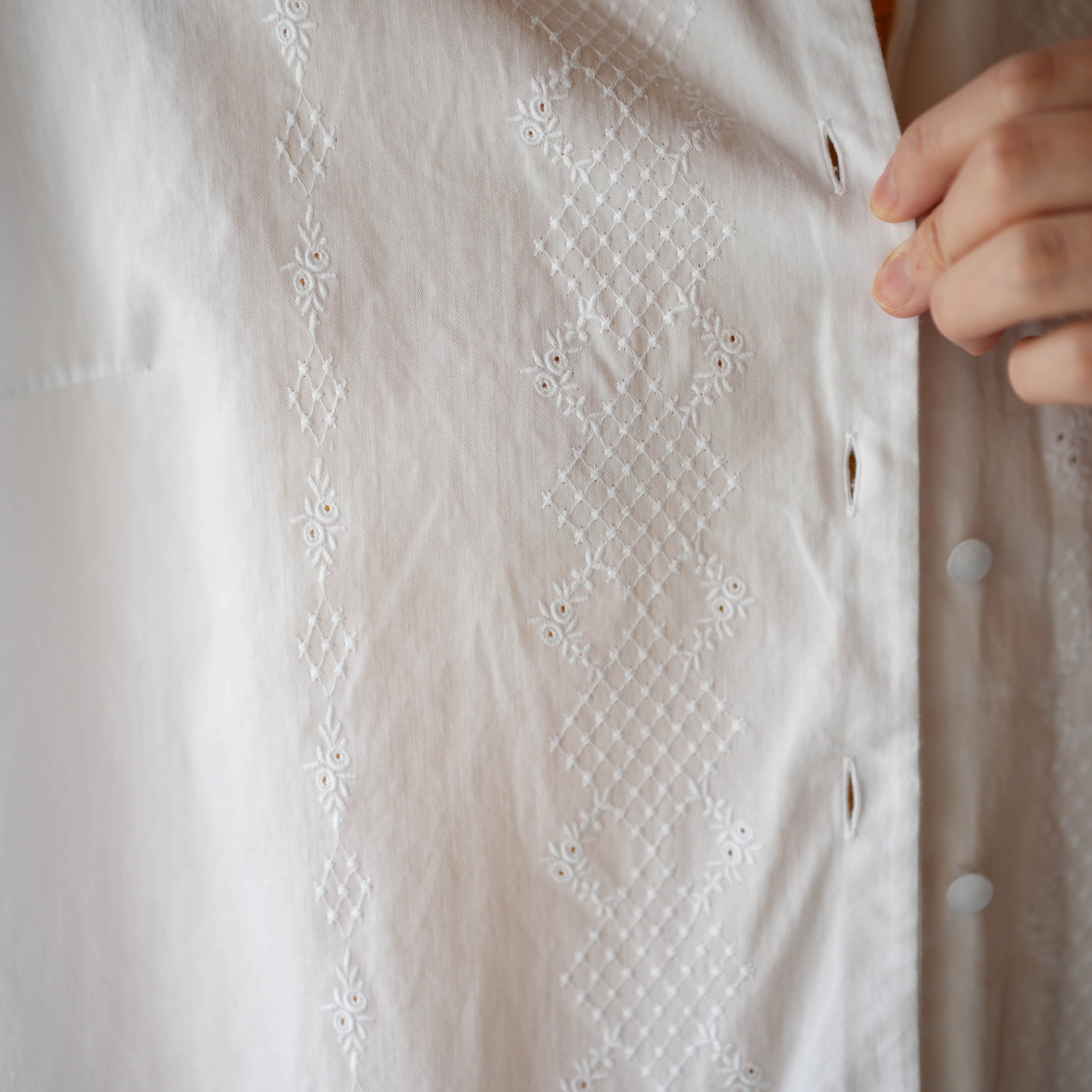 古着、アンティークもので黄ばみや日焼けのダメージのない白い服というのはかなり希少です。(毎日着る制服のシャツやYシャツなどは、洗濯していても袖口や襟元は汚れてしまいますよね)そして何十年も前の白ブラウスともなればさらに希少価値は上がります。白地に白の刺繡はさりげなくて、大人らしい雰囲気です。開襟の襟もかわいいです◎