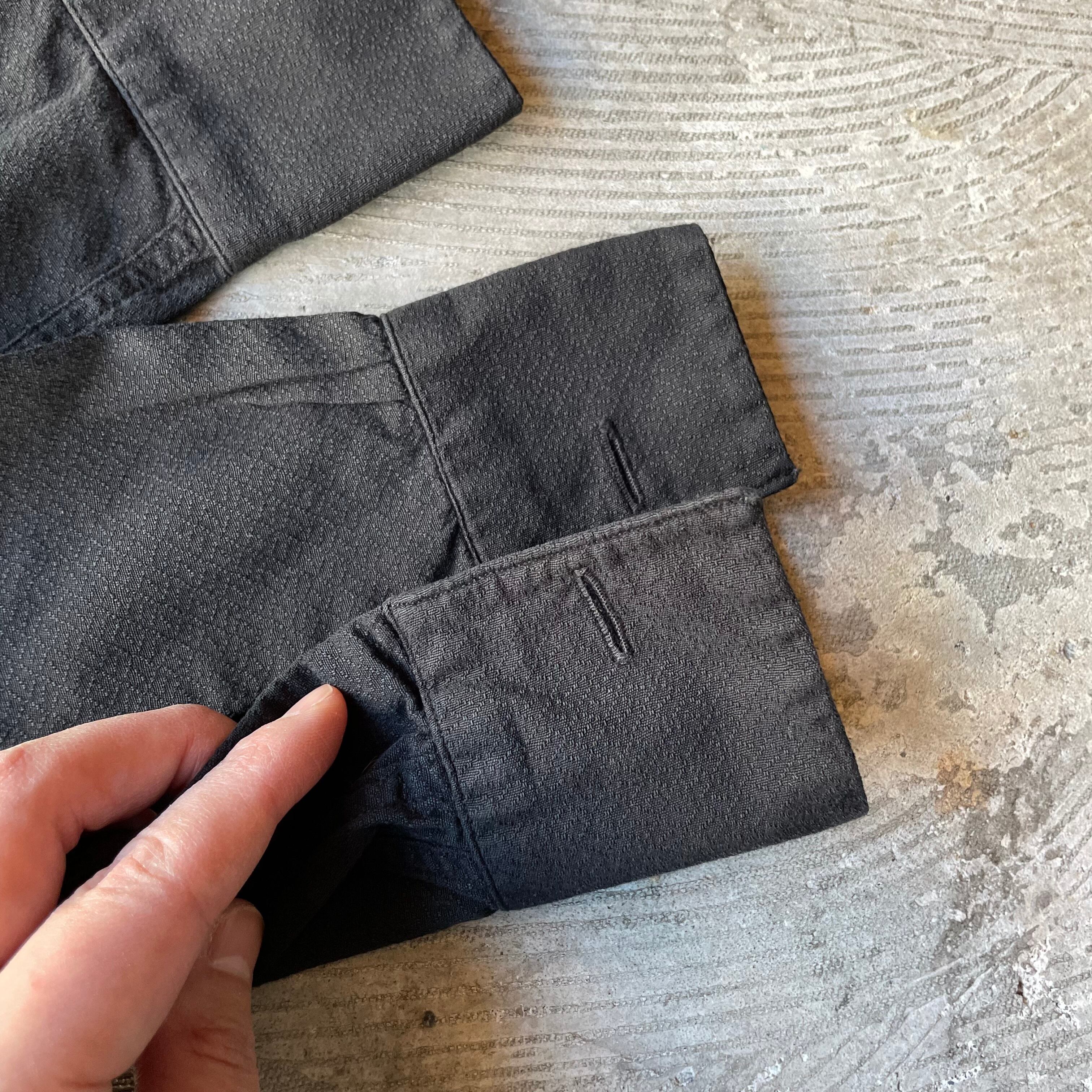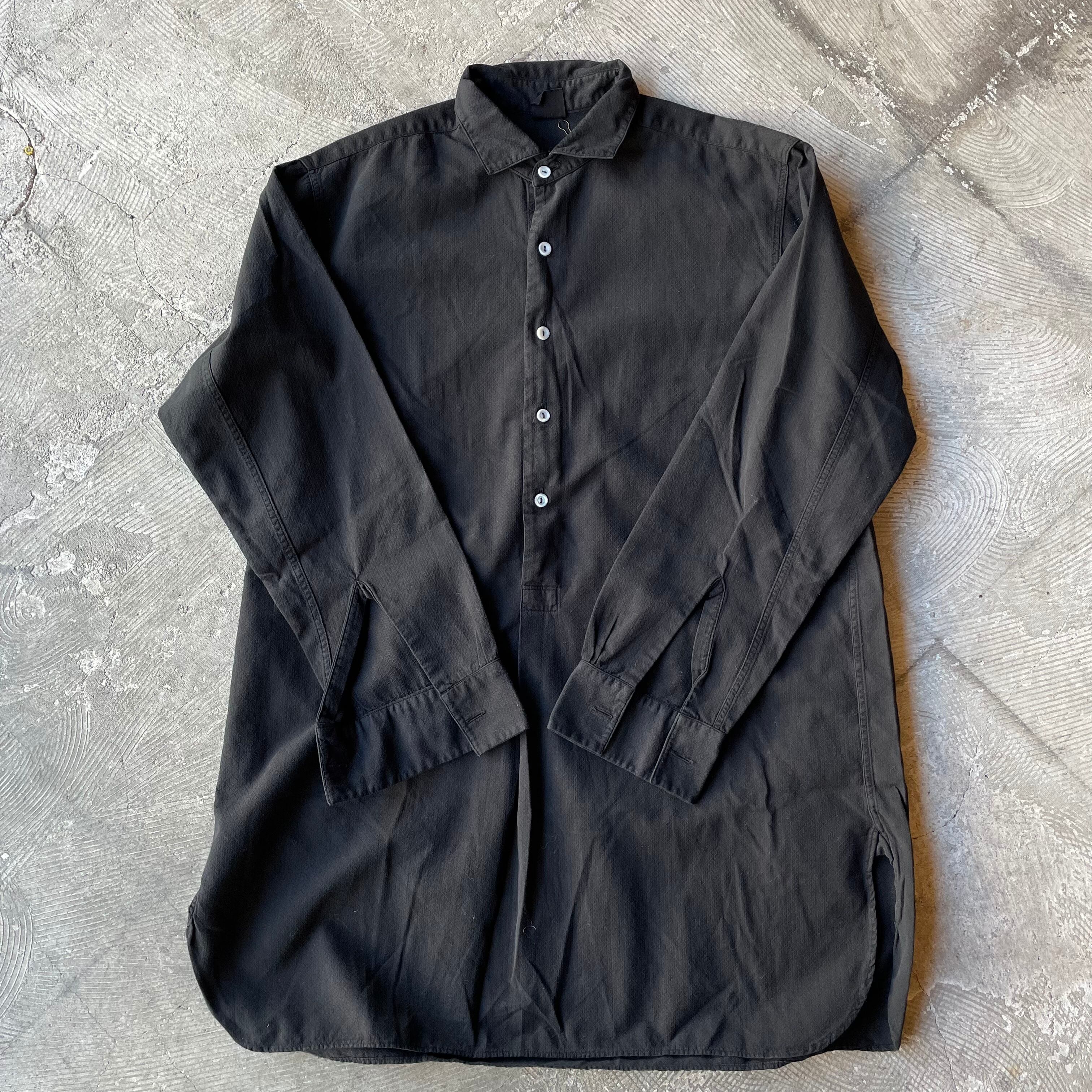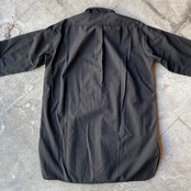 着丈が長いのが特徴的なグランドファーザーシャツ。小さめの襟が上品な印象です。袖口にボタンは付いていません。黒染め加工したオリジナル商品です。