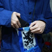 そのサッカーマフラーの主にエンブレム柄とフリンジを活かして、小さめのショルダーバッグ(サコッシュ)にリメイクしました。